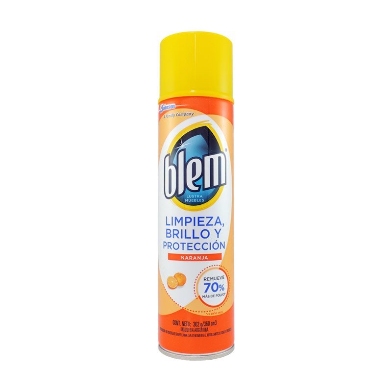 Blem lustramuebles limpiador en aerosol marca Blem. Con agradable aroma a naranja cada vez que se lo usa.