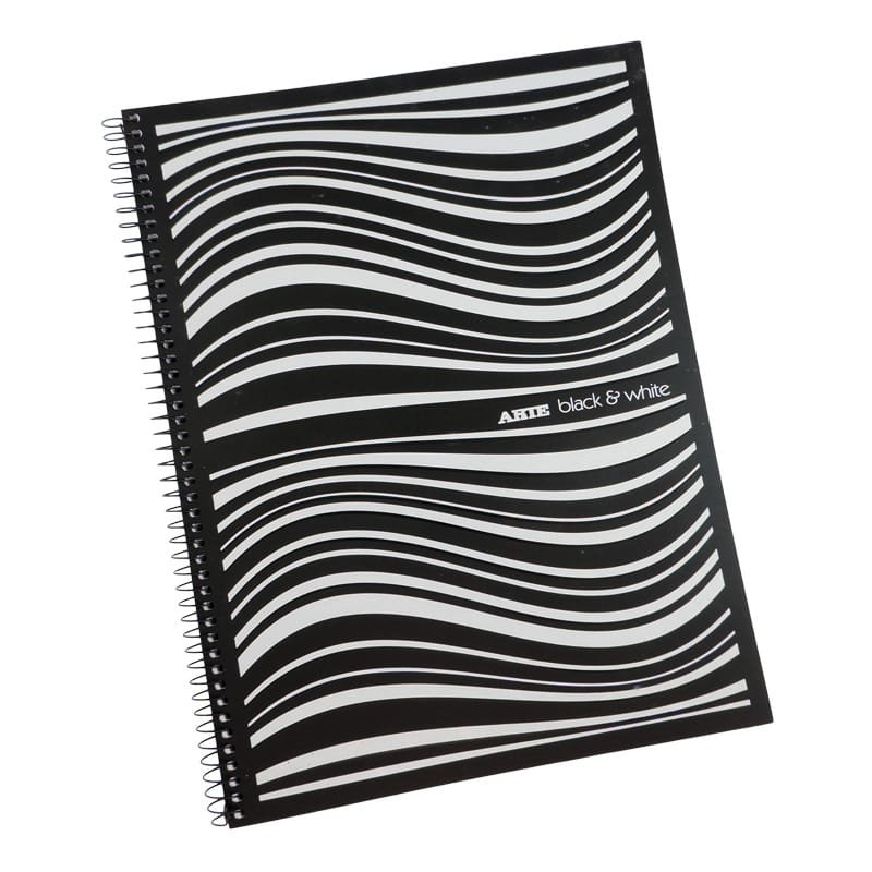 Cuaderno universitario con espiral y tapa semirigida de PVC. Color de tapa: blanco con dibujos negros.